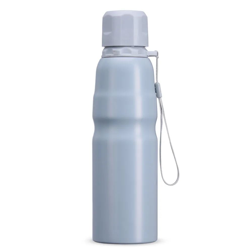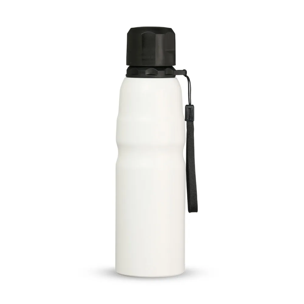Garrafa inox 800ml com tampa plástica rosqueável e cordão para transporte.