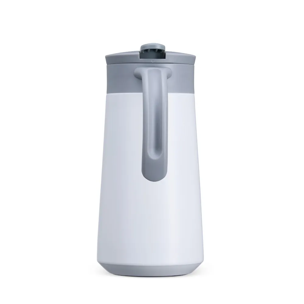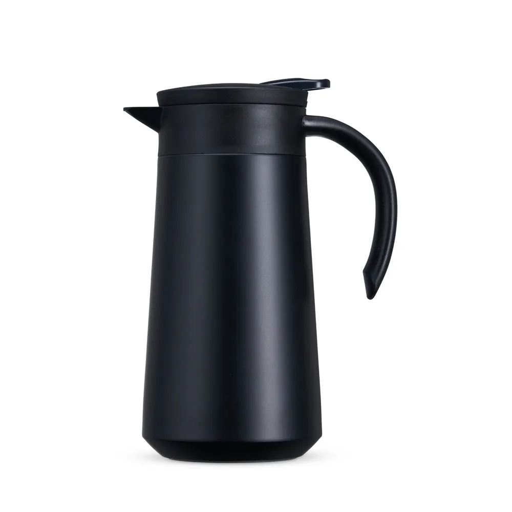 Garrafa Térmica feita em Inox 304 com parede dupla e capacidade de 800m. Tampa rosqueável com alavanca que abre/fecha para servir a bebida.