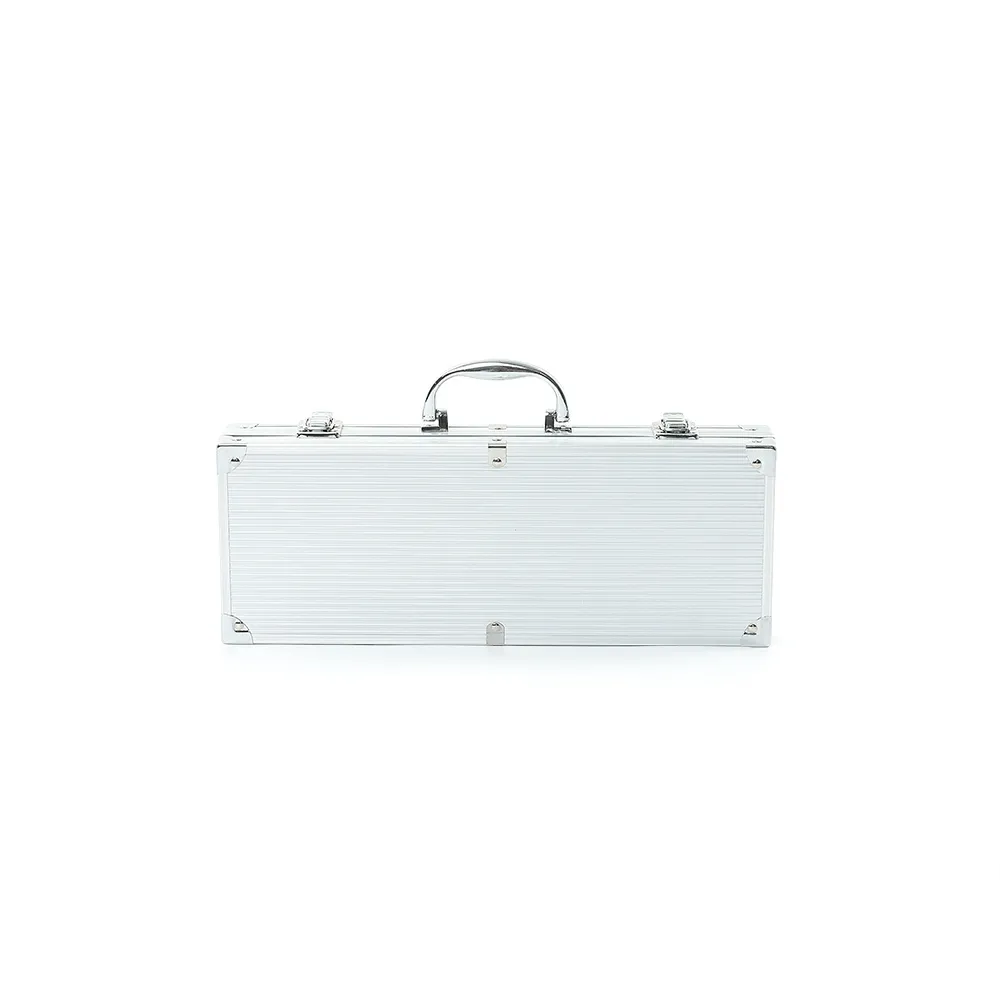 Kit churrasco 5 peças em maleta de alumínio com travas de segurança, contém três facas de corte, tesoura e chaira. Parte interna da maleta com revestimento em tnt e suportes de velcro para fixação das peças.